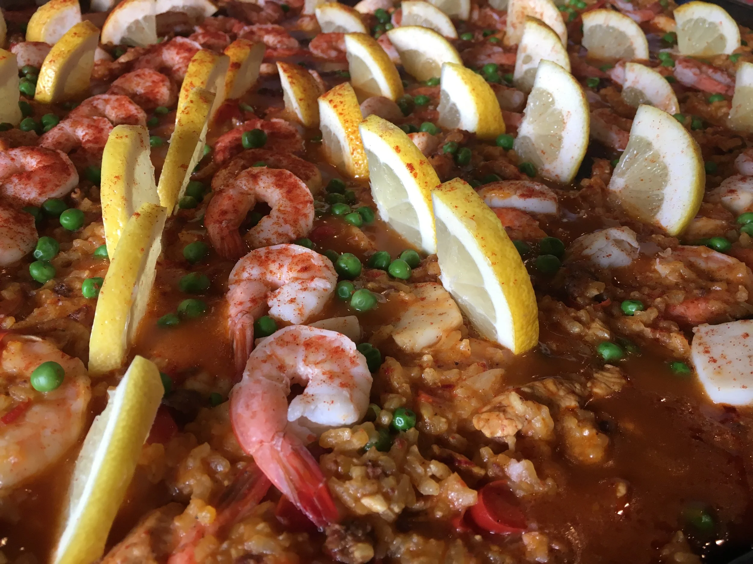 Paella is a traditional dish of Spain. Flavorful calasparra rice is cooked in a huge pan of mussels, shrimp, scallops, and chorizo sausage. Served with a fresh salad and dessert.