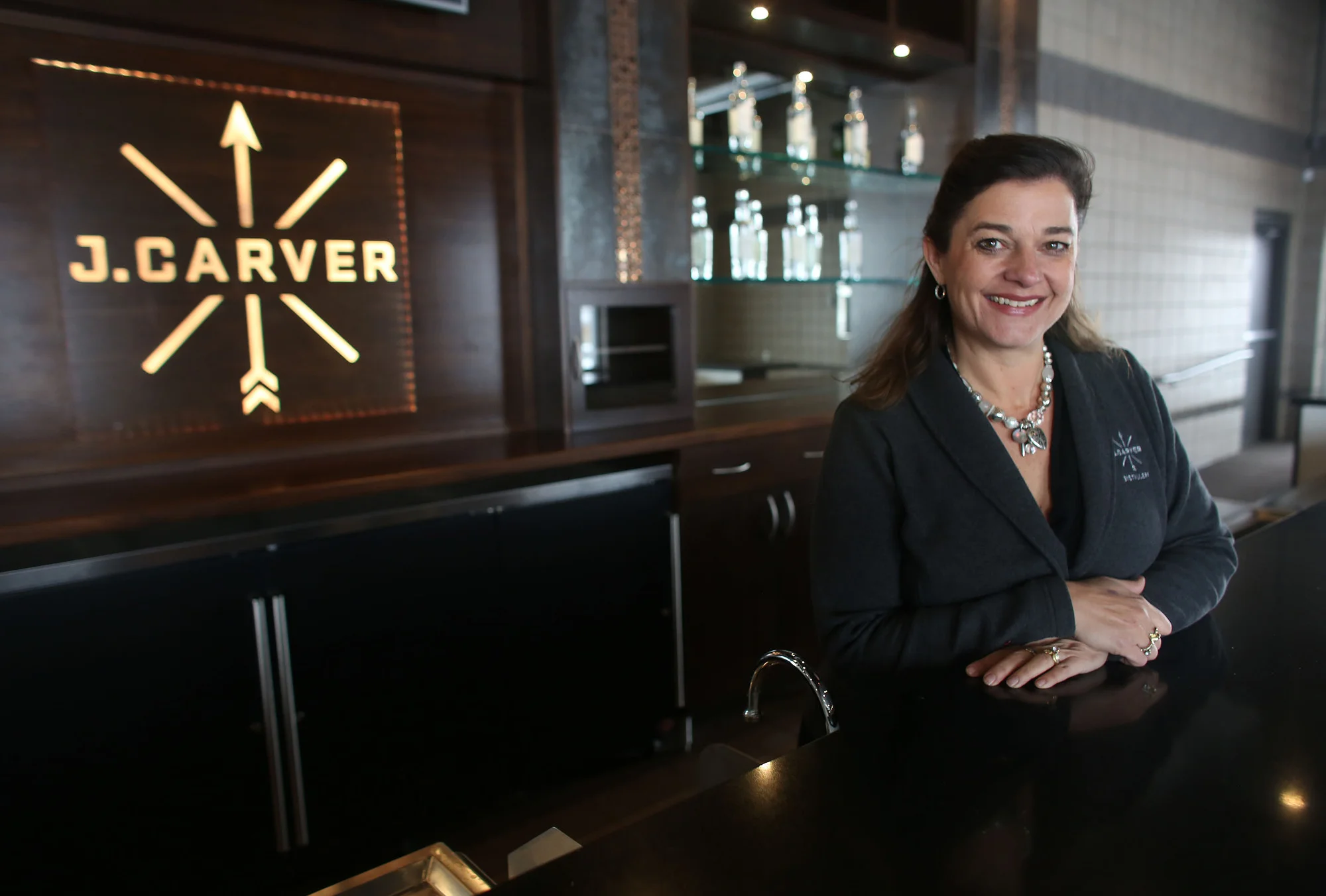 Gina Holman, of J. Carver distillery, stood behind the bar in the event space where they will have tastings. Photo: Kyndell Harkness, Star Tribune